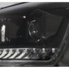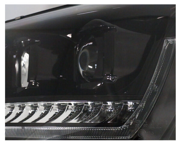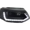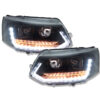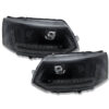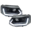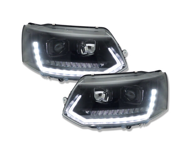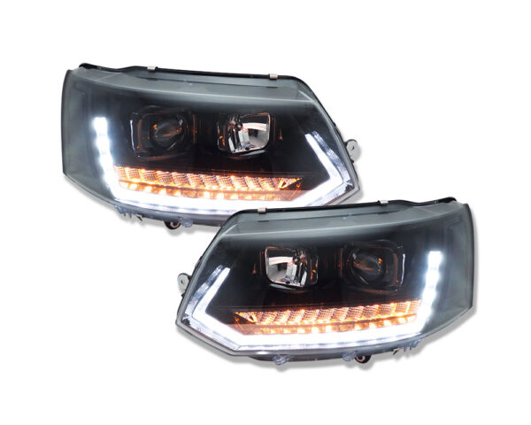 LED-Tagfahrlicht-Scheinwerfer für den VW T5 GP (Generation 2) mit Produktionsjahren von 2009 bis 2014. Diese Scheinwerfer zeichnen sich durch eine pianoschwarze Oberfläche und dynamische Blinker im Upgrade-Stil aus.