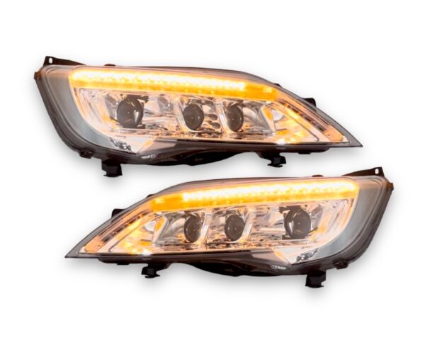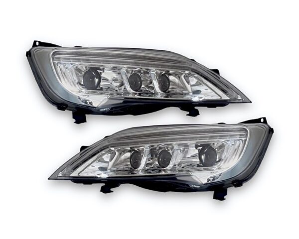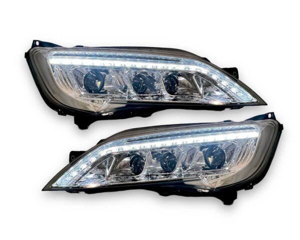 Diese Scheinwerfer sind eine Neuheit, da sie LED-Abblend- und Aufblendlicht verwenden und somit das erste Voll-LED Scheinwerfer-Upgrade für diese Fahrzeuge darstellen. Sie sind vollständig kompatibel mit den Serienfahrzeugen, verursachen keine Fehlermeldungen und verwenden Original-Steckverbindungen. Die Scheinwerfer verwenden echte LED-Projektionsmodule für Fern- und Abblendlicht, was eine hervorragende und gleichmäßige Lichtausbeute gewährleistet – im Gegensatz zu herkömmlichen LED-Nachrüstleuchtmitteln, die eine hohe Streuweite aufweisen und oftmals andere Verkehrsteilnehmer blenden.