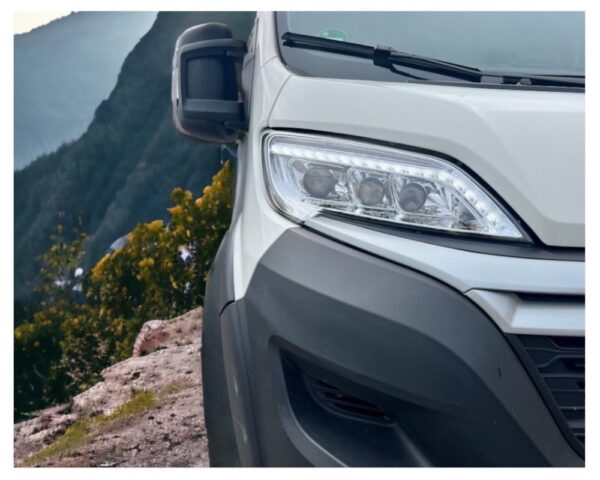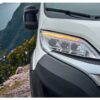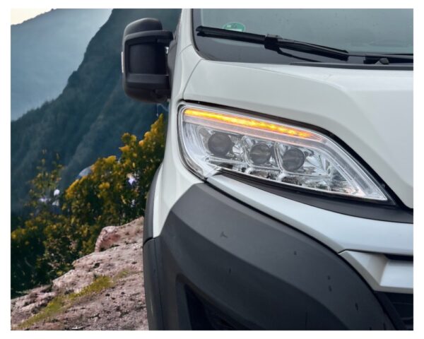 Voll-LED Tagfahrlicht-Scheinwerfer für Fahrzeuge der Marke Fiat Ducato, Peugeot Boxer und Citroen Jumper, einschließlich aller Wohnmobile auf diesem Chassis. Diese Scheinwerfer sind in Chrom gehalten und verfügen über einen dynamischen LED-Blinker. Sie sind für Modelle ab dem Baujahr 2014 geeignet und wurden speziell entwickelt, um Scheinwerfer mit originalem LED-Tagfahrlicht aufzurüsten.